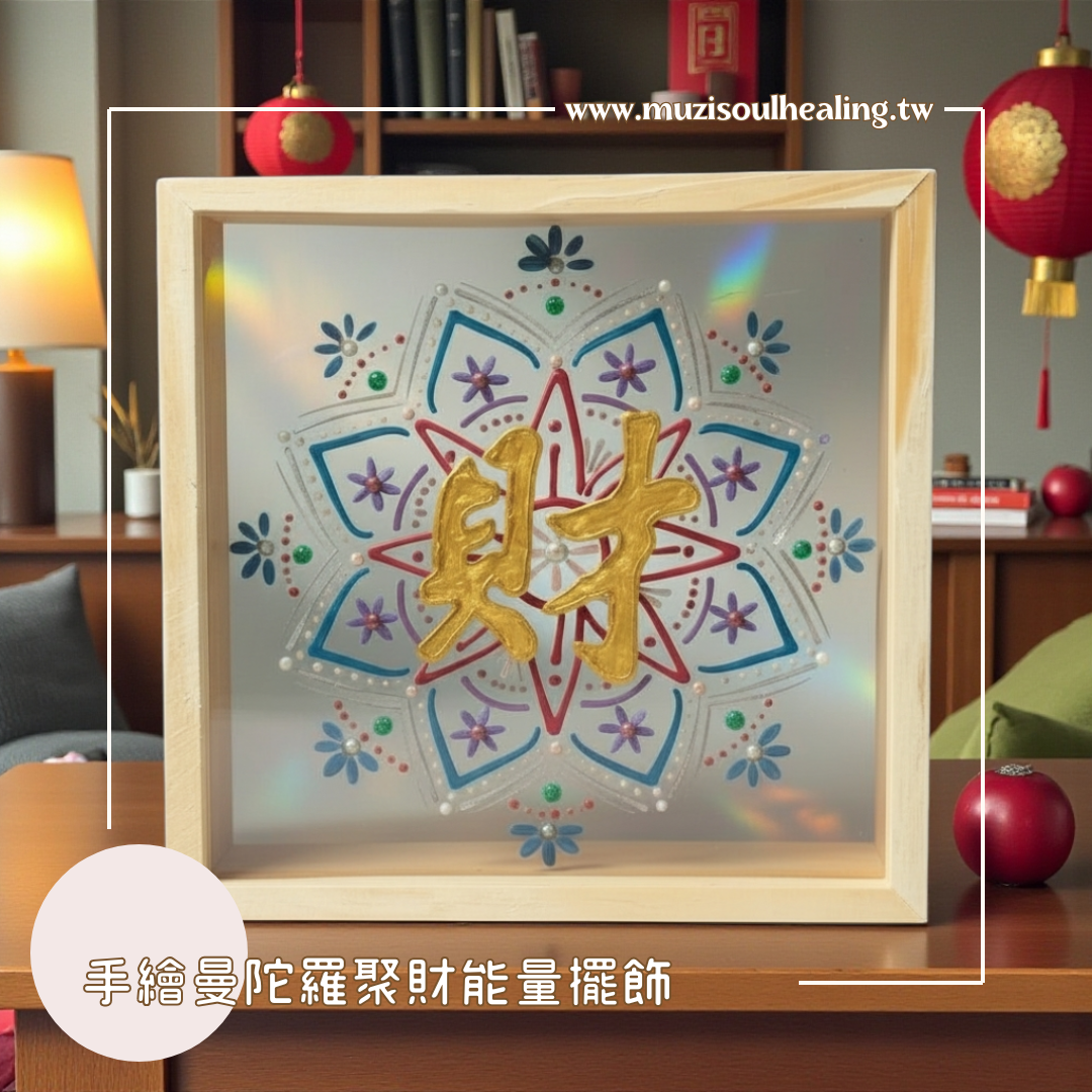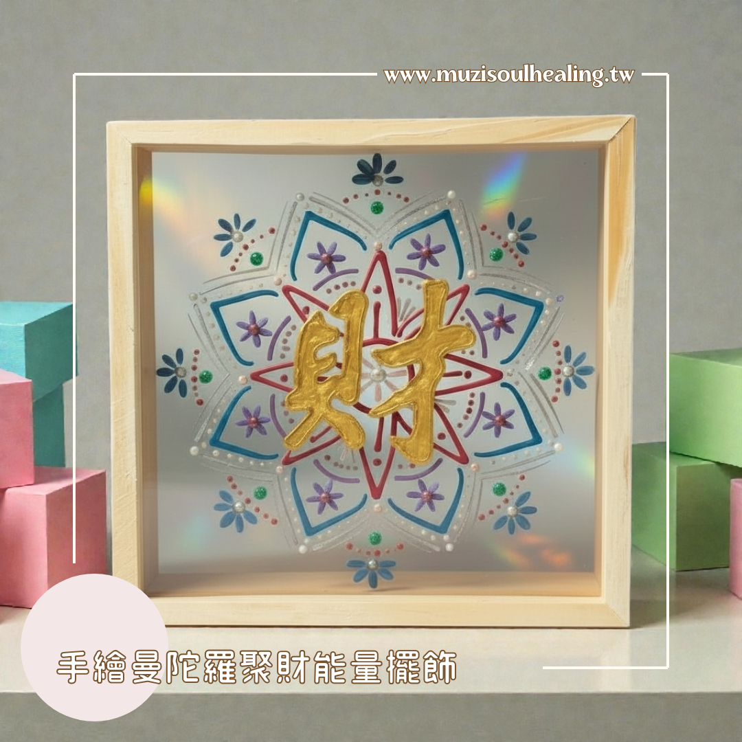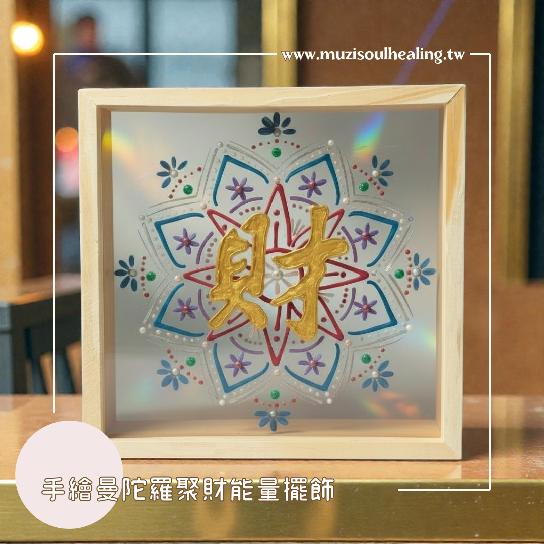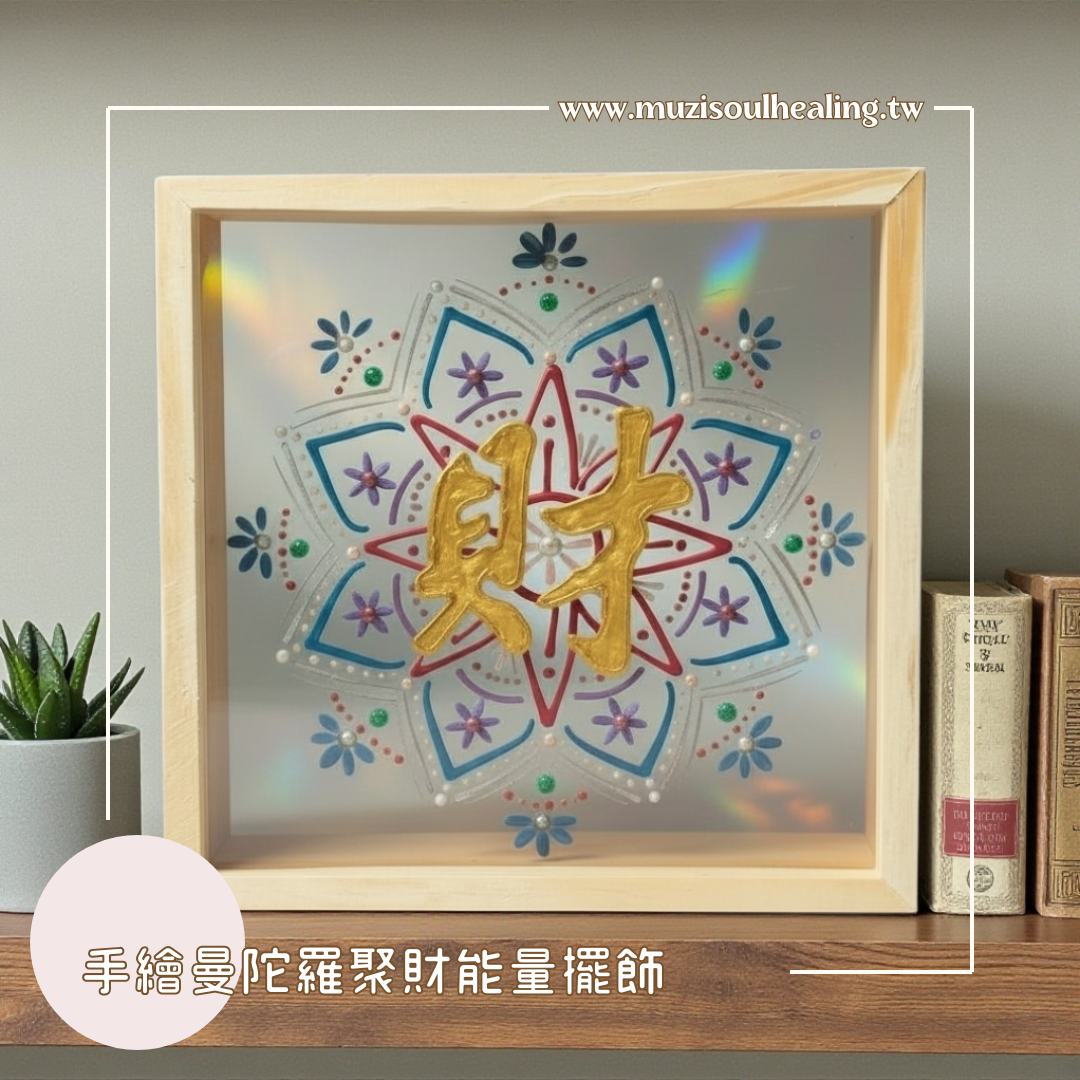 這幅 「聚財」手繪曼陀羅能量擺飾,讓我們能穩定、流動與擴展,中心金色「財」字,如同一顆被喚醒的內在太陽,溫柔卻堅定地告訴你——財富,不只是金錢,而是一種被支持的生命狀態。