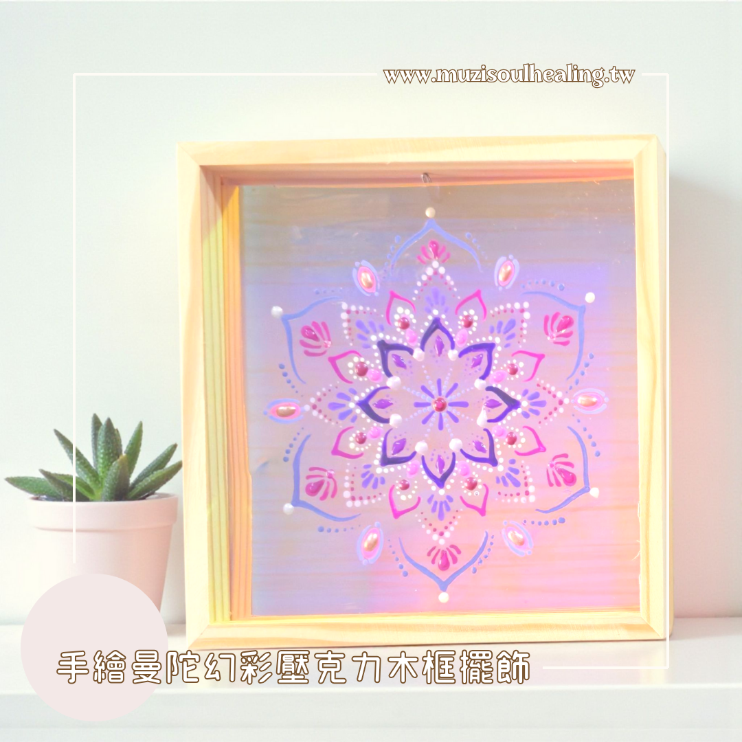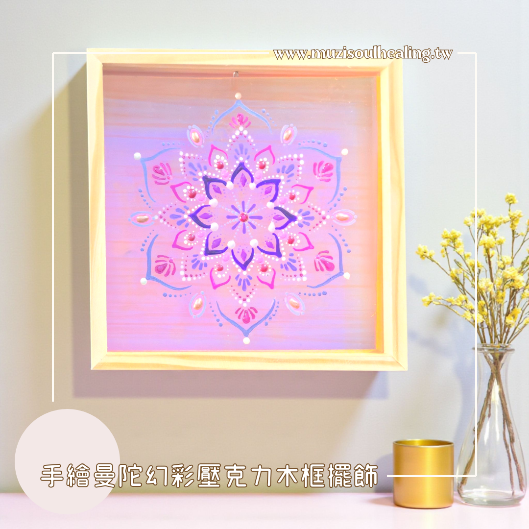 這款「手繪曼陀羅幻彩壓克力木框擺飾」以柔霧粉、桃紫、玫瑰光等高頻色調創作,